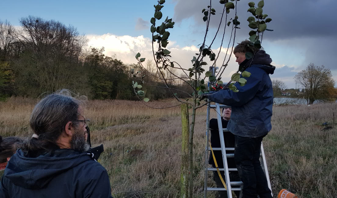 gemeinsam die richtige Vorgehensweise zum Schnitt einiger Kernobstbäume und üben in der